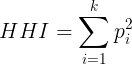 The Herfindahl–Hirschman Index (HHI) is a measure of concentration that describes how evenly or unevenly observations are distributed across categories. It is calculated by summing the squares of the proportions of each category: