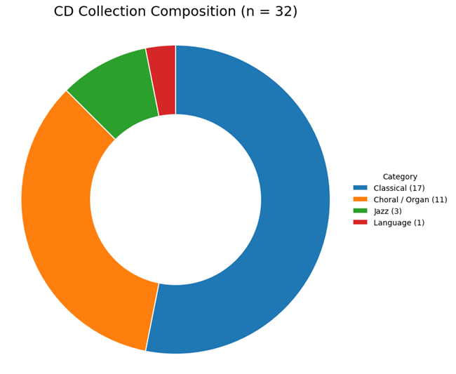 OK, the man had strong musical tastes. He knew what he liked, that much is certain. I immediately wanted to know how concentrated his CD collection is. The CD collection is focused on a few musical categories, with the majority of recordings falling into the classical and choral traditions. Earlier, I mentioned that I want to quantify all that is quantifiable. There is a metric that addresses the issue: the Herfindahl–Hirschman Index (HHI). I have never needed to use it, and I am glad it has come up now.