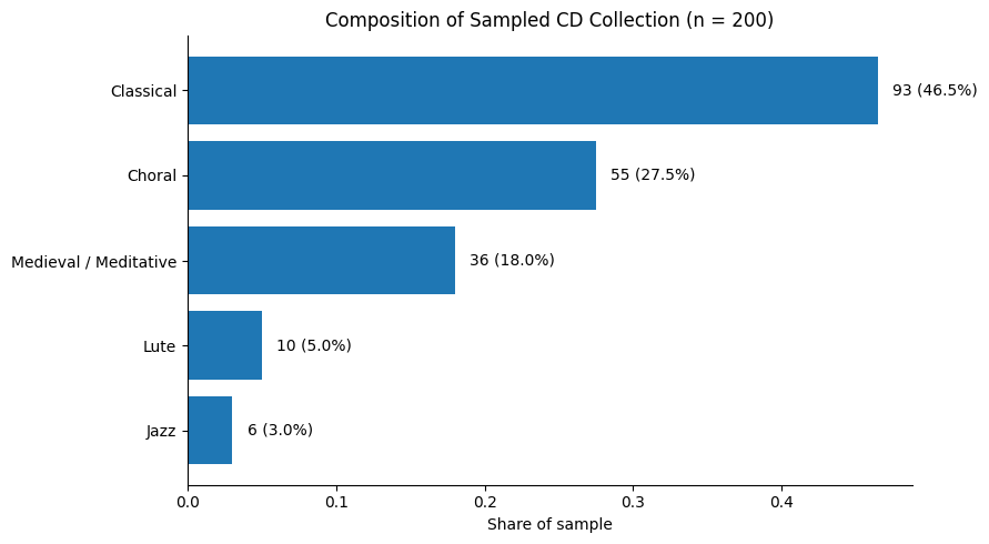 The output from the equation means I can get a result at the 95% confidence interval with a +/- 6% error if I sample 200 CDs. Believe it or not, if he had an infinite number of CDs, all I would need is a sample of 384 to achieve a +/- 6% error range at this confidence interval. I have always found that fascinating. It is an unexpected outcome (maybe a quirk?) of statistical analysis. Since I received a little over 1000 CDs, I decided to pull out a random sample of 200 CDs. Here are the results.